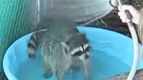 Радостный енот принимает душ